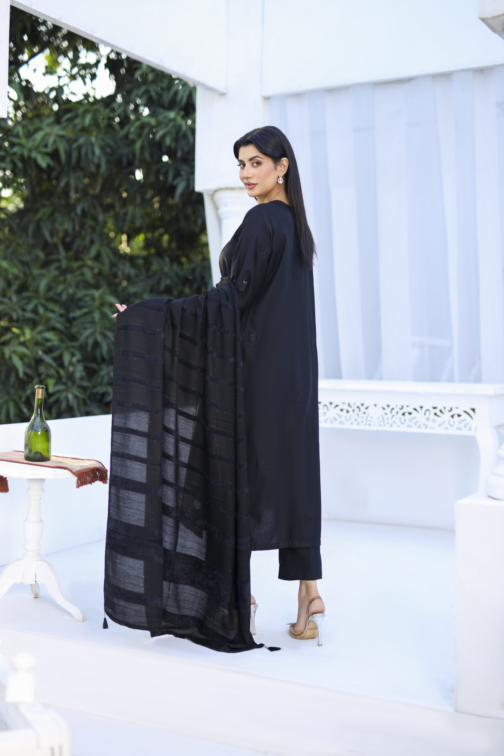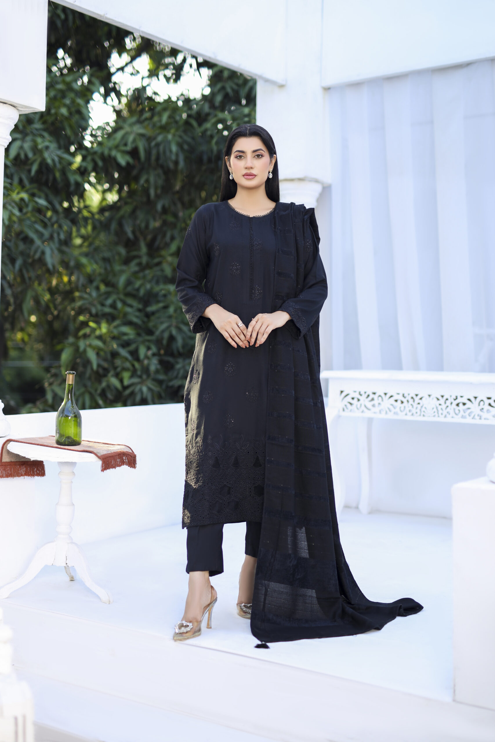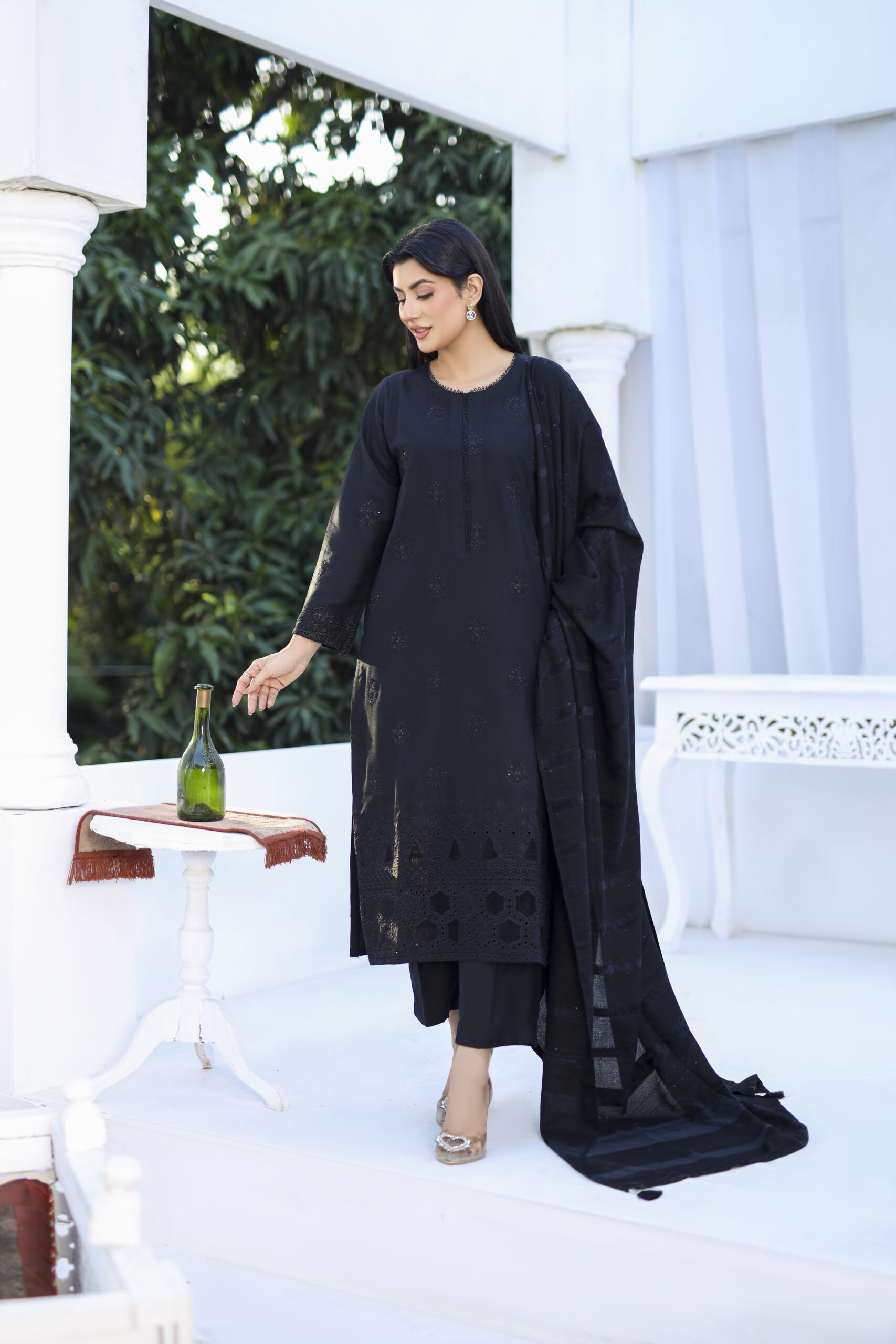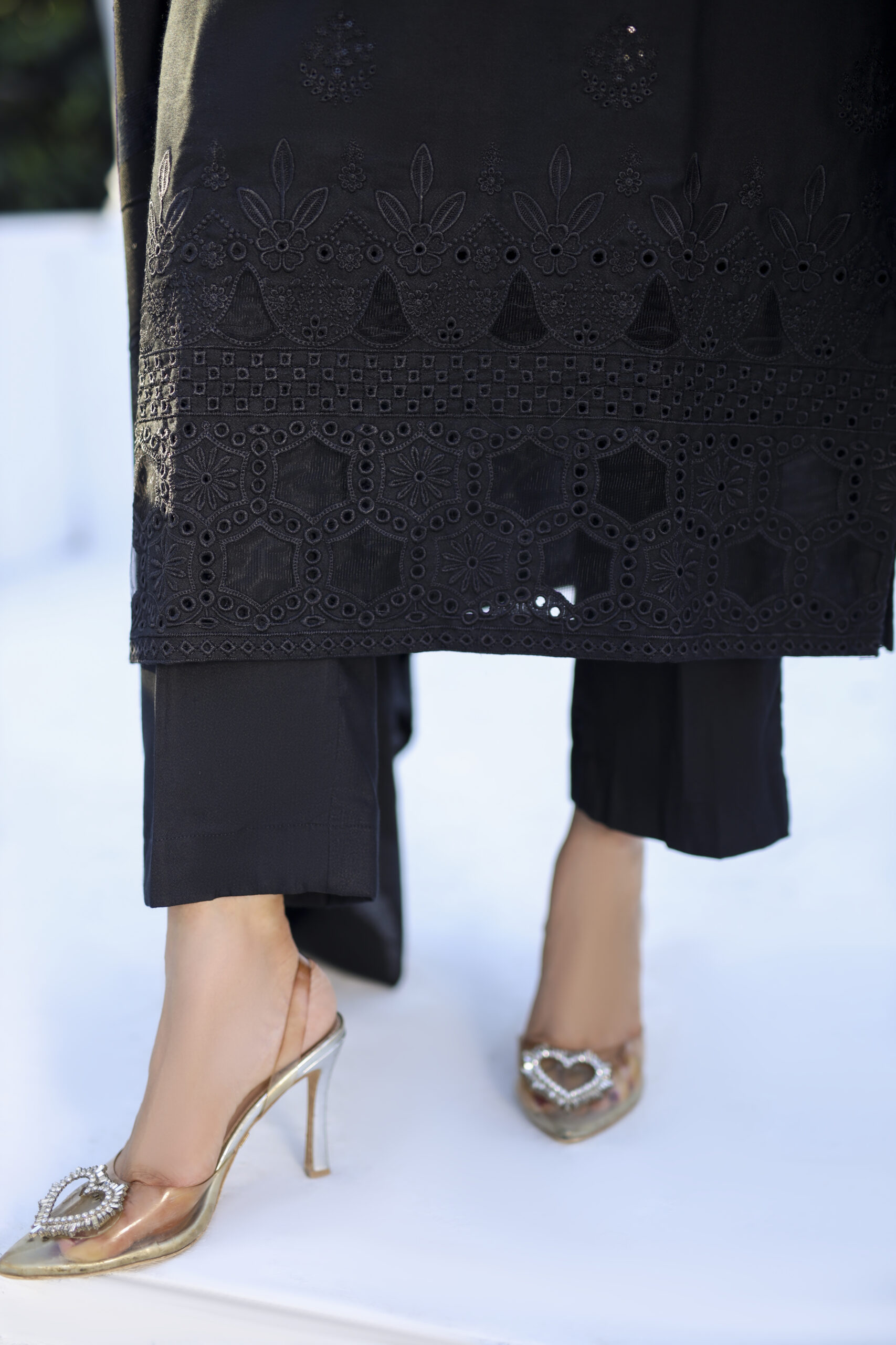 Straight-cut slightly relaxed fit long silhouette, featuring full-length sleeves with embroidered cuffs. Round neckline with light detailing features a dense hemline, wide border of cutwork and detailed floral & geometric motifs.