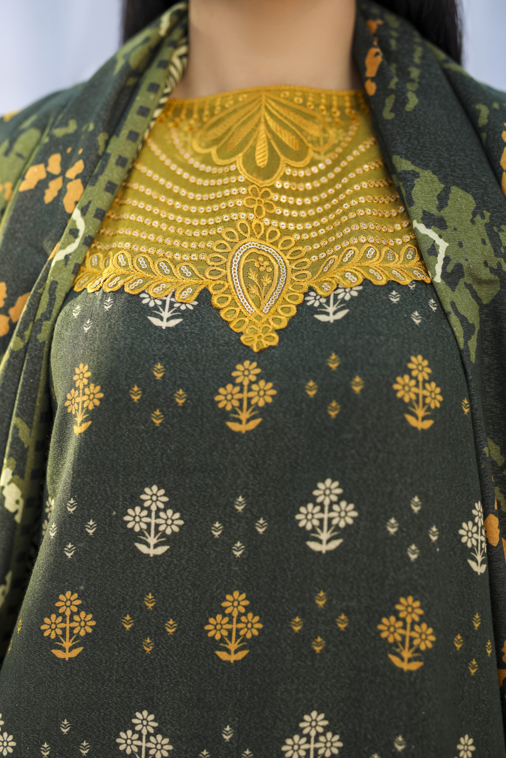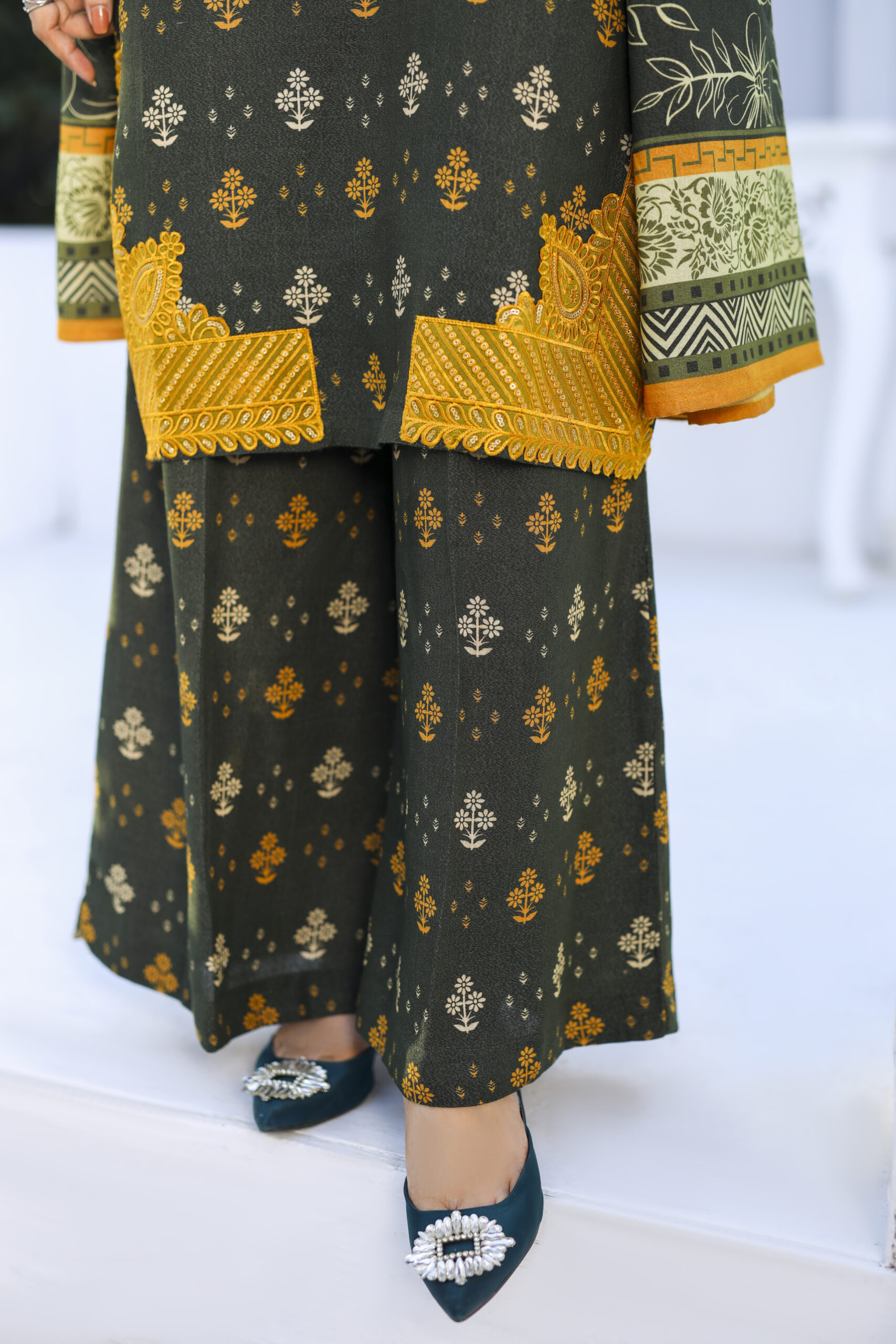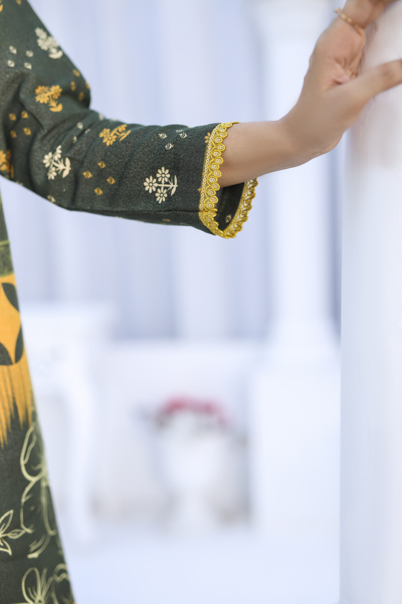 Straight style shirt and falls to a long length, likely mid-calf. Slightly wide neckline features yoke area across the chest is distinct, being solid mustard with intricate embroidery and detailed sequin embelishment.
