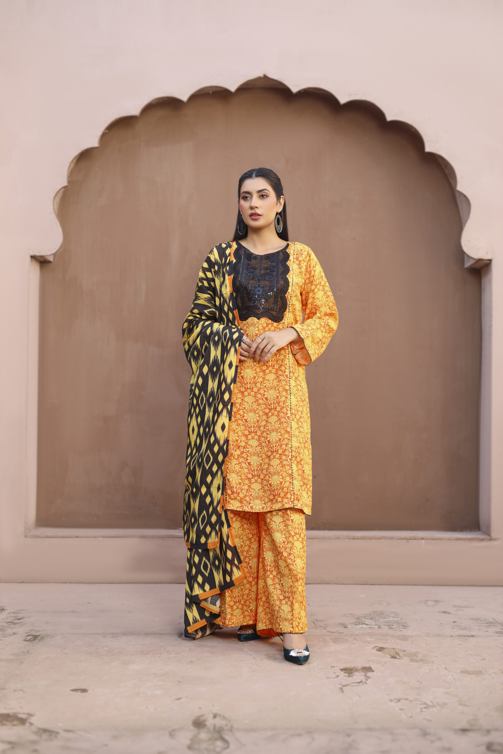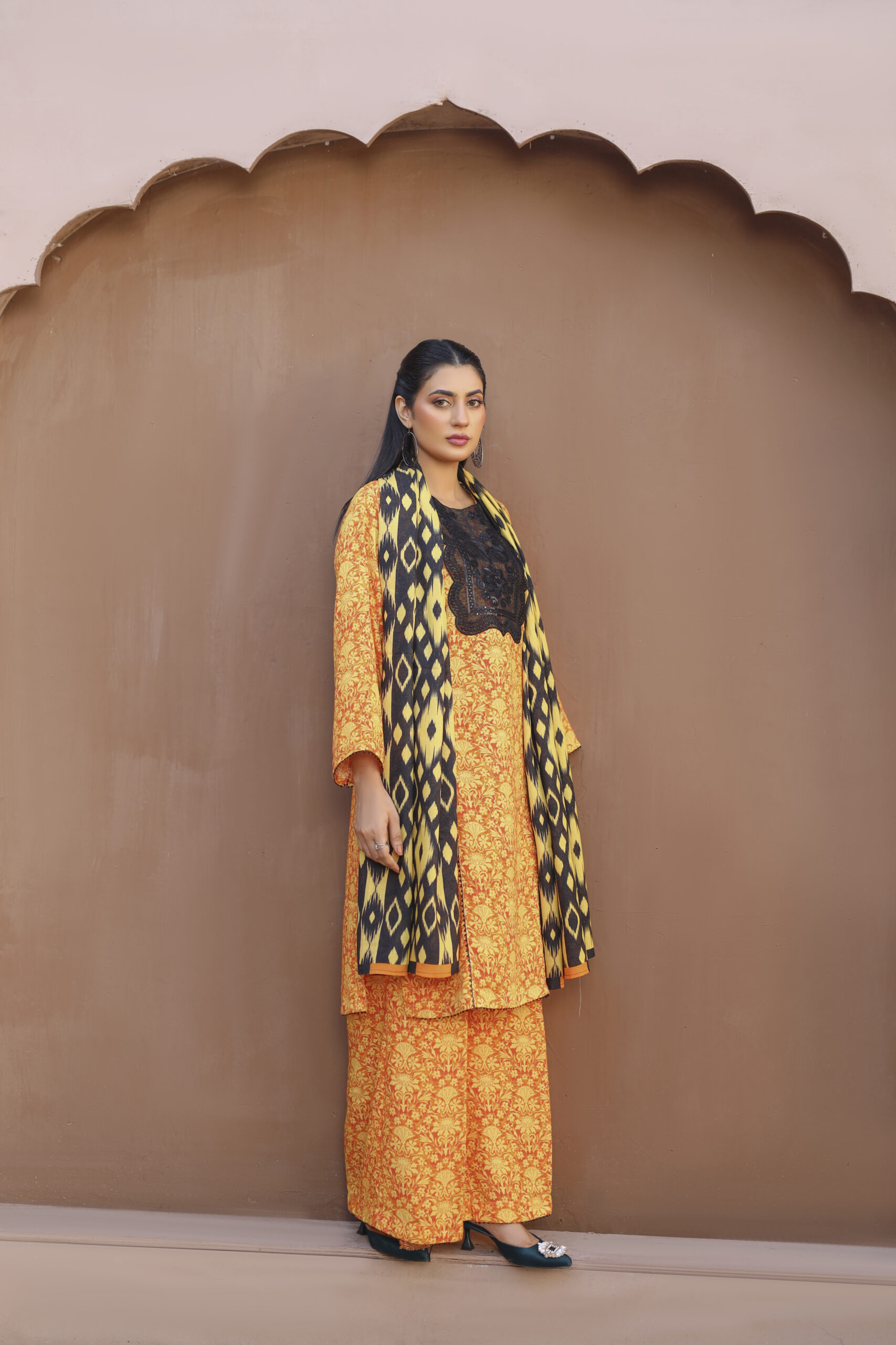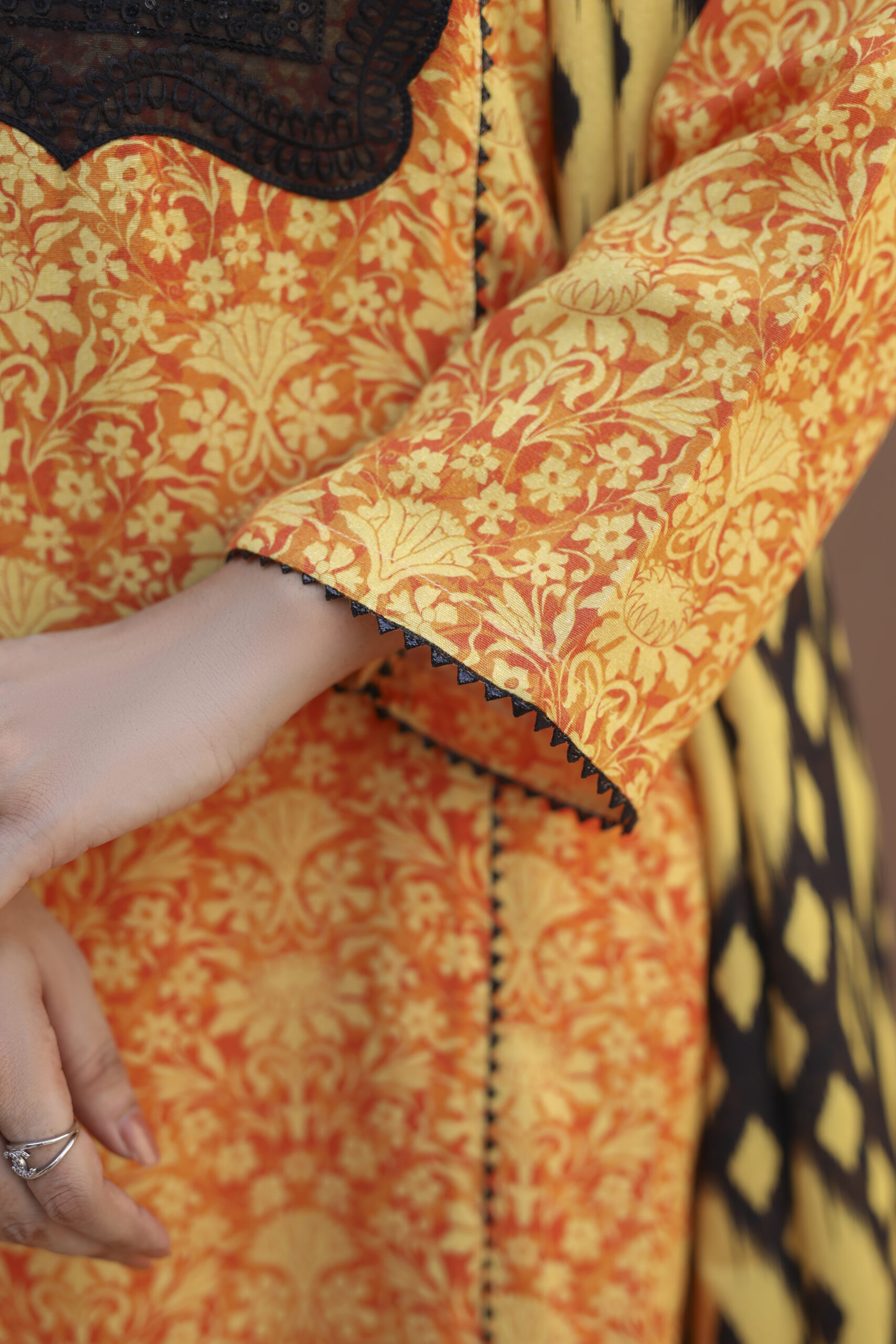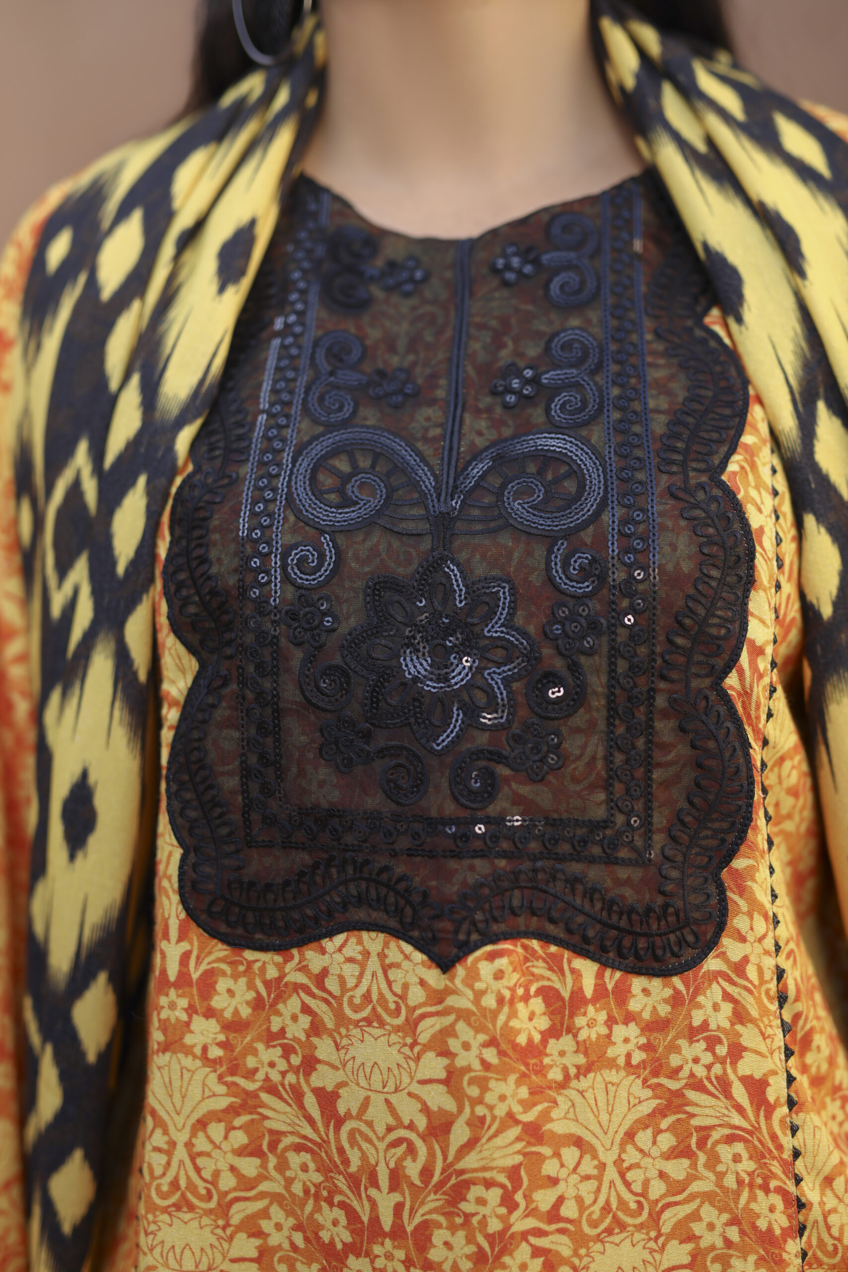 Straight-cut shirt with moderate length.Shirt striking, heavily embellished Black Yoke/Neckline with black thread, sequins, or a dense lace, creating a sharp contrast.