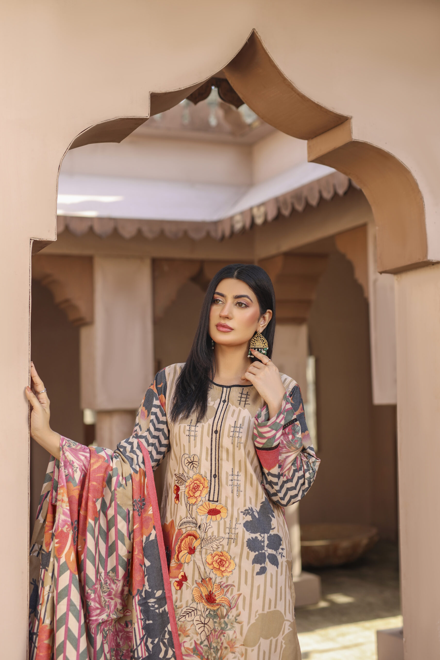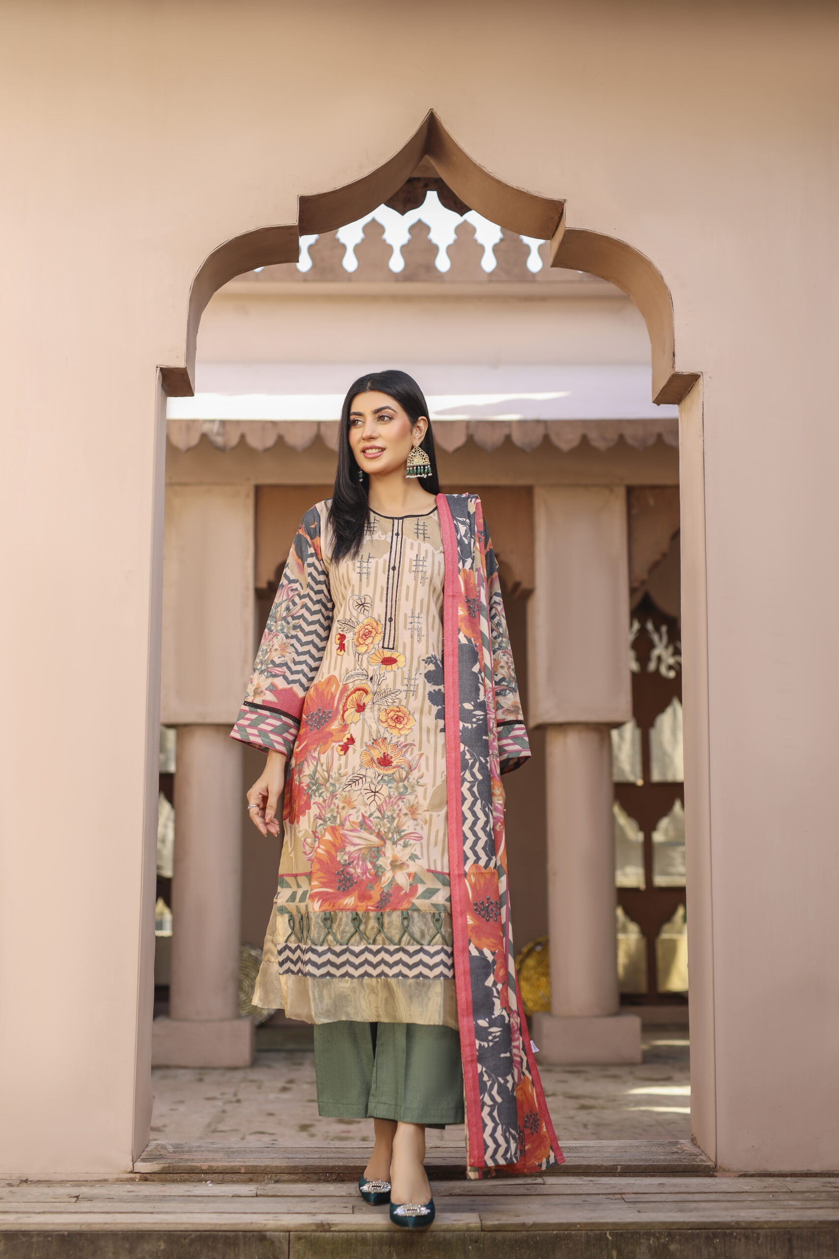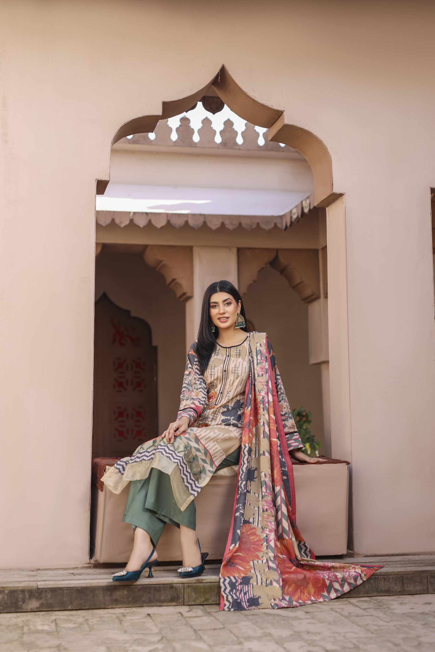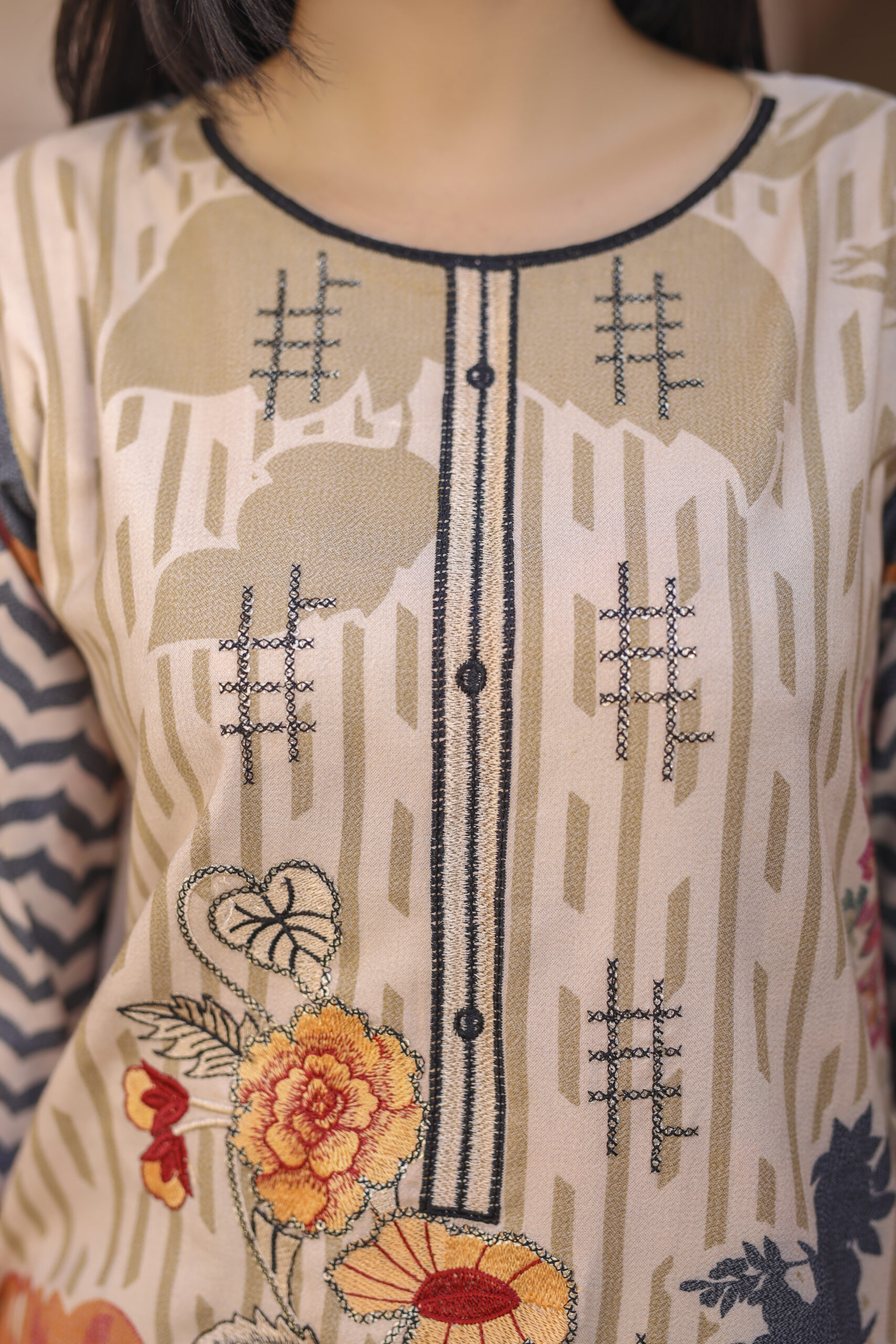 Full length sleeves with a mix of chevron.Straight-cut pants, contrasting nicely with the printed kameez.