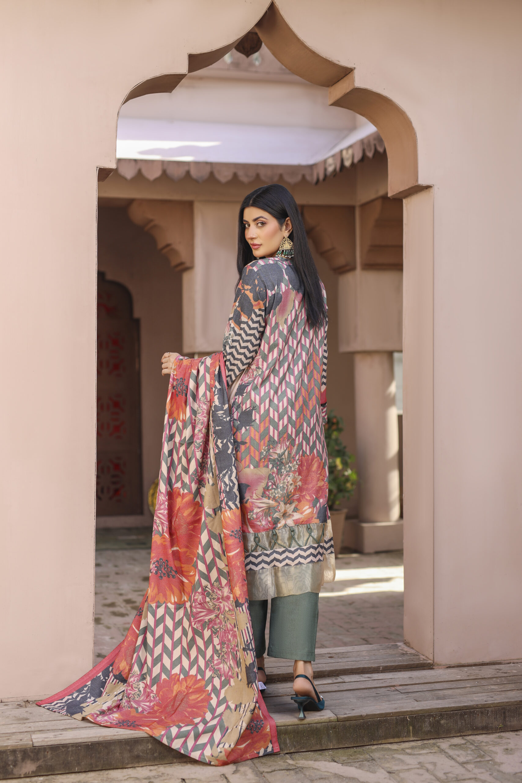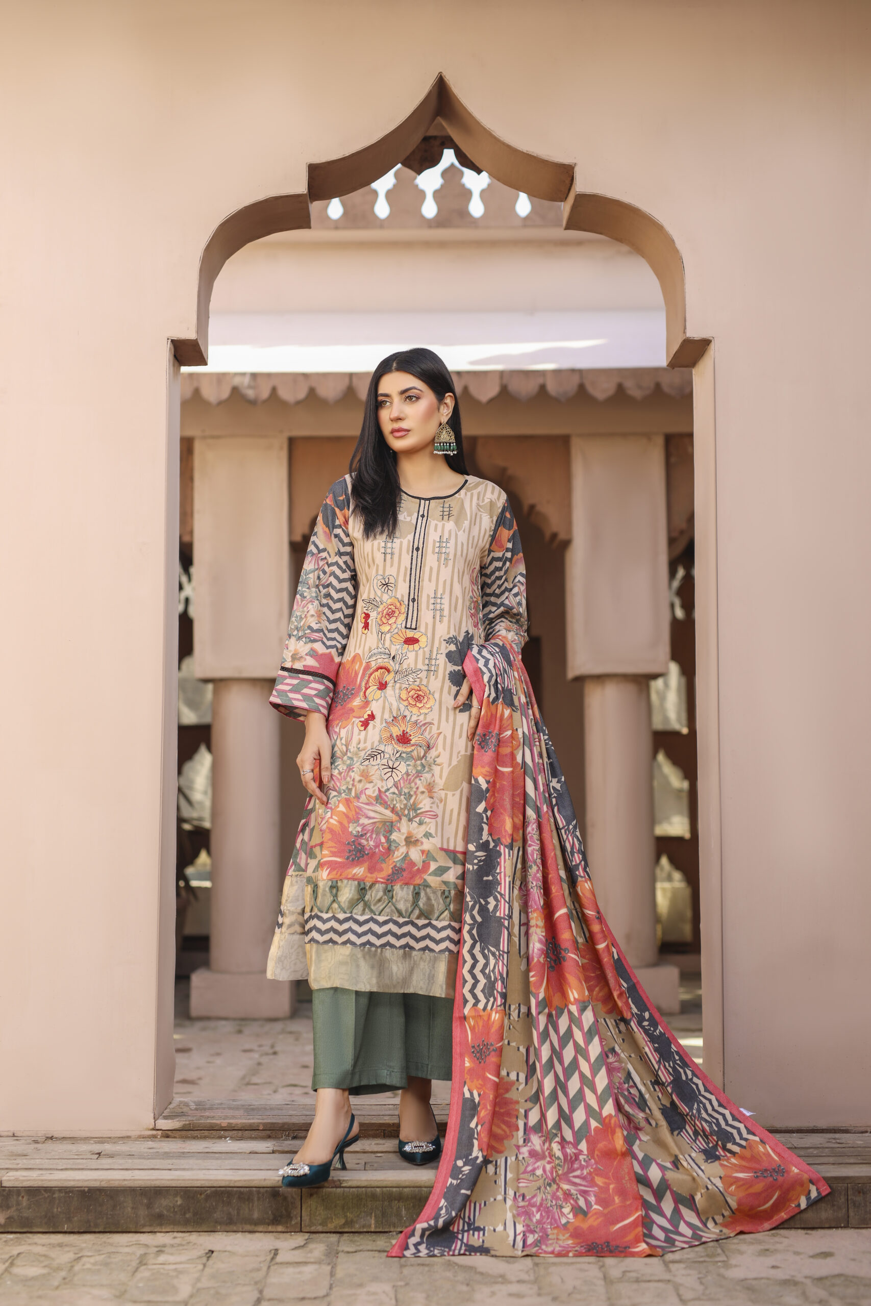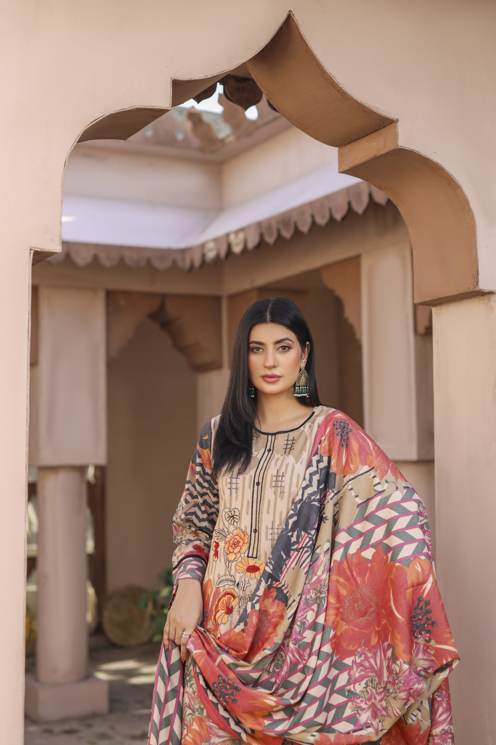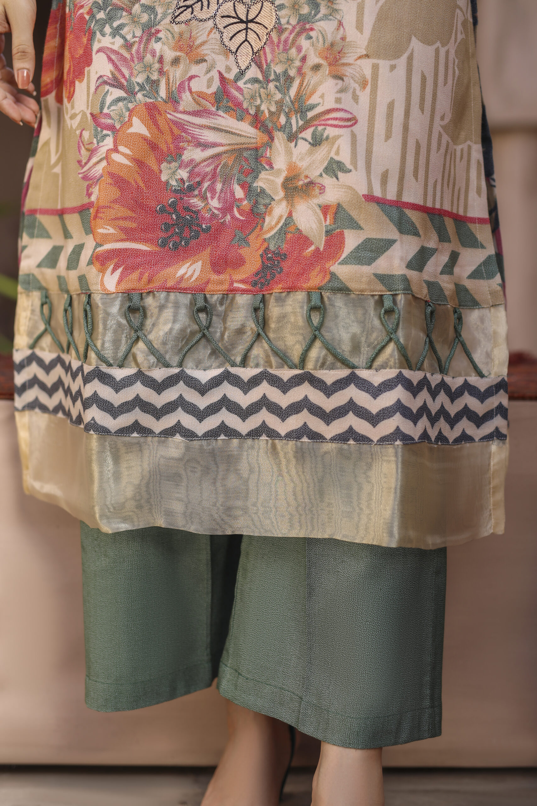 Full length sleeves with a mix of chevron.Straight-cut pants, contrasting nicely with the printed kameez.